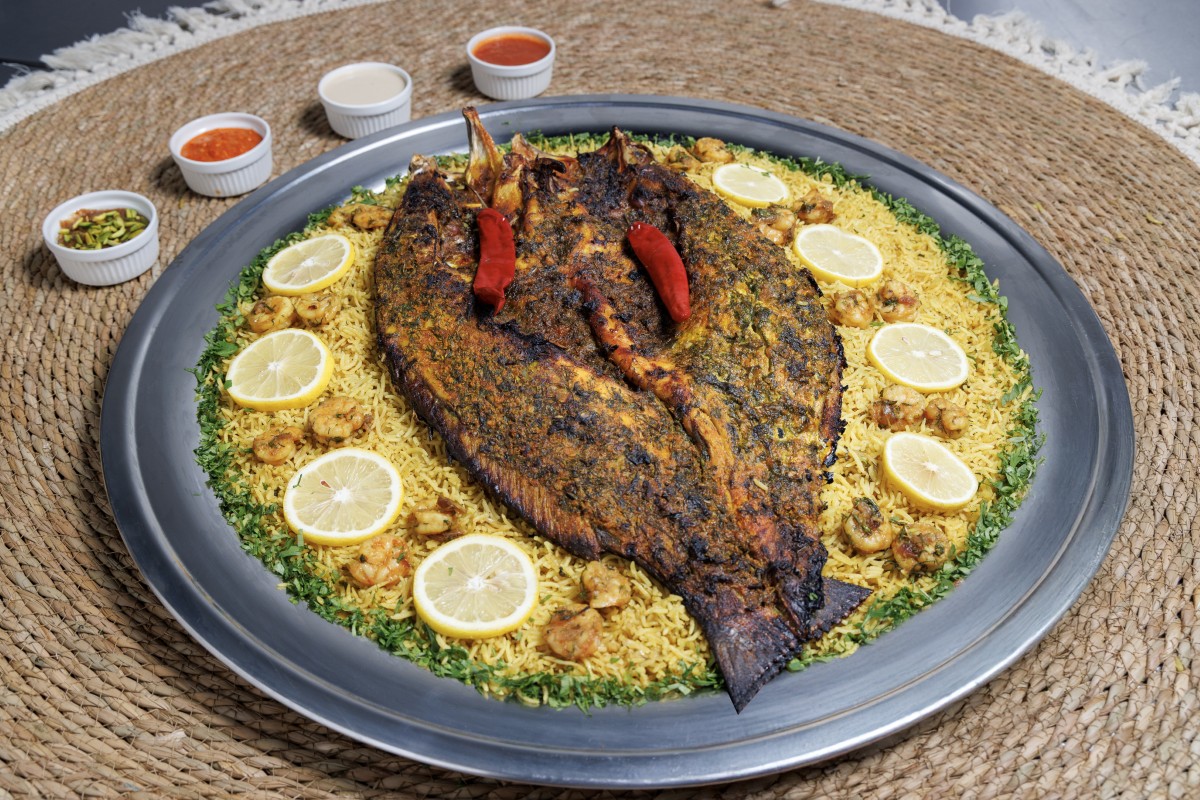 Relish the taste of one freshly caught Seabas fish, grilled to perfection for a tender, flavorful bite. Served with fluffy rice mixed with shrimp, complemented by tangy Mahbuj, zesty Dakous, and creamy Tahina, plus a sweet Halwa to end on a delightful note. Perfect for 5 people.